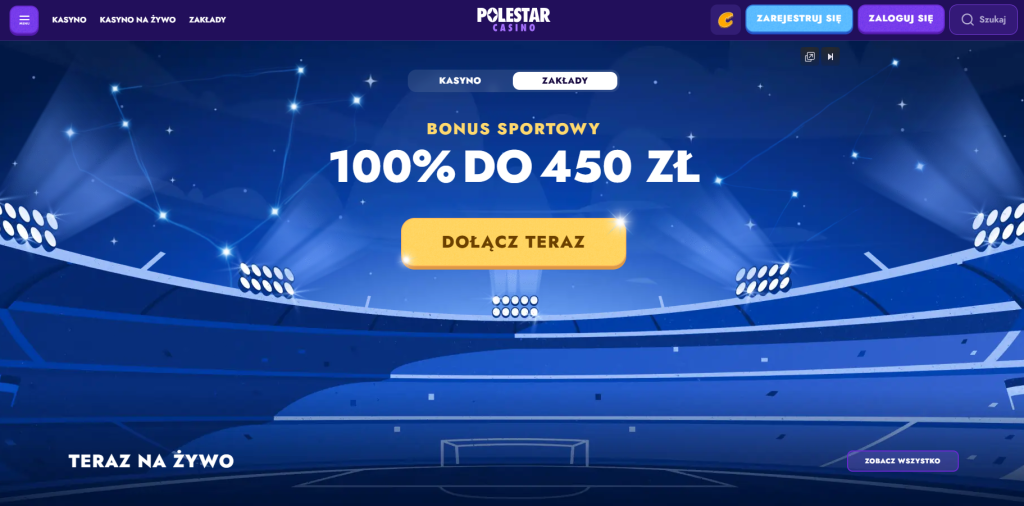 • PolestarCasino – rozbudowana sekcja sportowa z bonusem powitalnym 100% do 500 PLN. Podwyższone kursy, zestawy wzmocnione do 100%, program zwrotów 10% do 2250 PLN. Bonusy specjalistyczne: wyścigi konne 50% do 225 PLN, zakłady e-sportowe 50% do 225 PLN, wirtualna FIFA 25% do 225 PLN. Obsługa kryptowalut i kompletna polska lokalizacja.